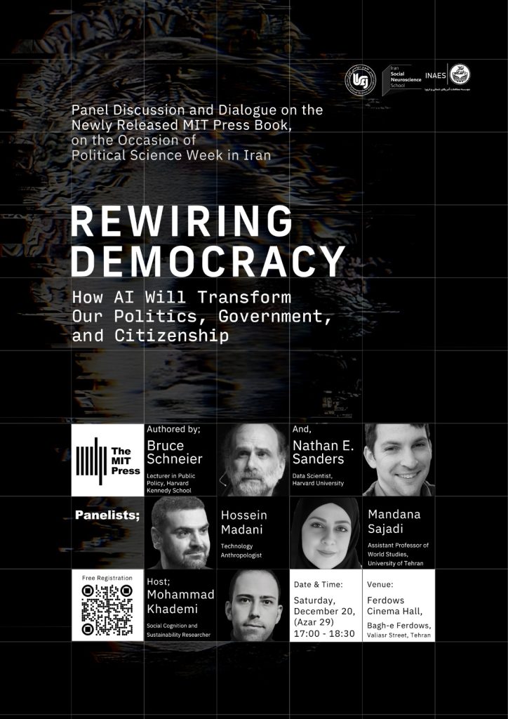 مدرسه علوم اعصاب اجتماعی با همکاری انجمن علوم سیاسی ایران و مؤسسه مطالعات آسیا و اروپا دانشگاه تهران، به مناسبت هفته بزرگداشت دانش سیاست، نشستی تخصصی برای گفتوگو و بررسی کتاب تازهمنتشرشدهی انتشارات MIT Press با عنوان Rewiring Democracy: How AI Will Transform Our Politics, Government, and Citizenship برگزار میکند. این نشست با محوریت رابطهی میان هوش مصنوعی و دموکراسی، به بازاندیشی در ساختارهای حکمرانی، مشارکت مدنی و آیندهی سیاست در عصر هوش مصنوعی میپردازد و فرصتی برای گفتوگویی میانرشتهای میان پژوهشگران علوم شناختی، علوم سیاسی، و مطالعات فناوری فراهم میسازد.